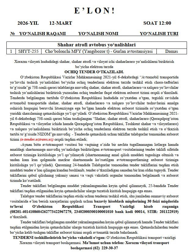 Tender Transport vazirligi Xorazm viloyati transport boshqarmasi tomonidan 2026-yil 12-mart kuni soat 12:00 da o‘tkaziladi.