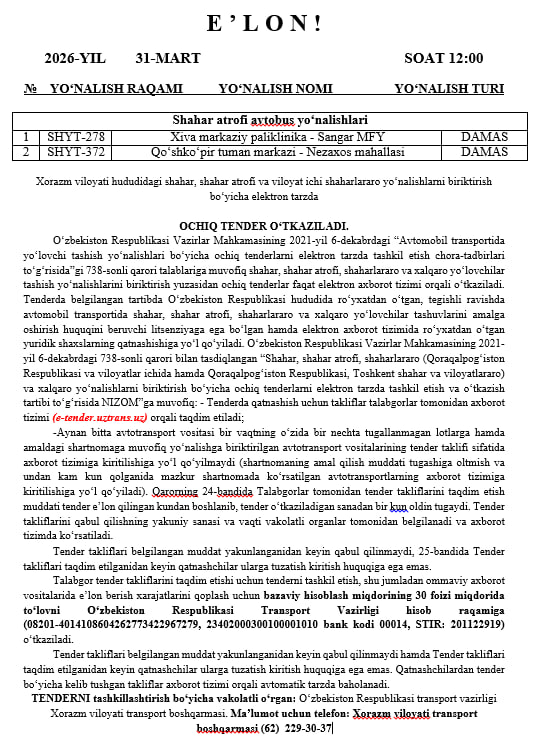 Tender Transport vazirligi Xorazm viloyati transport boshqarmasi tomonidan 2026-yil 31-mart kuni soat 12:00 da o‘tkaziladi.