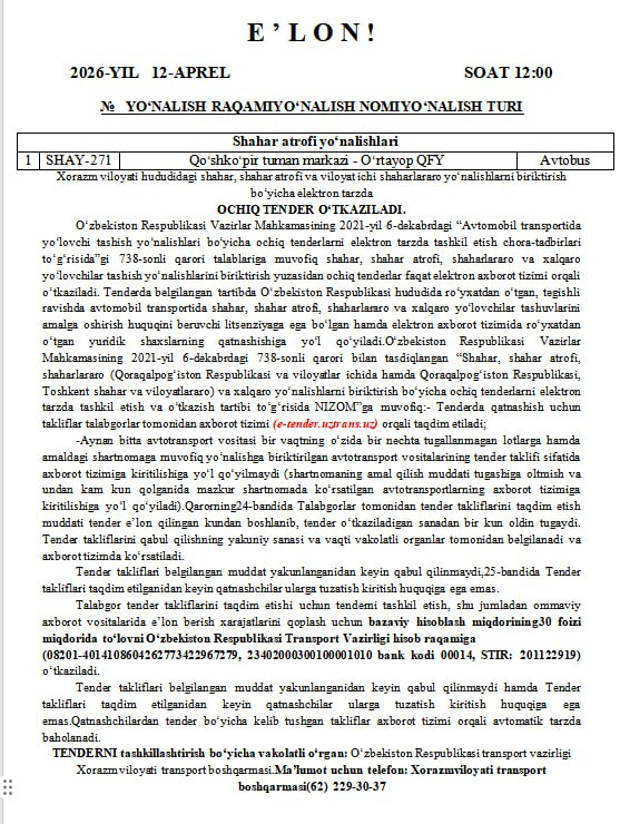 Tender Transport vazirligi Xorazm viloyati transport boshqarmasi tomonidan 2026-yil 12-aprel kuni soat 12:00 da o‘tkaziladi.