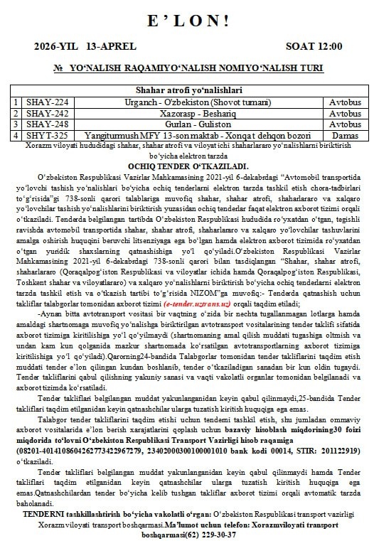 Tender Transport vazirligi Xorazm viloyati transport boshqarmasi tomonidan 2026-yil 13-aprel kuni soat 12:00 da o‘tkaziladi.