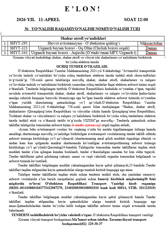 Tender Transport vazirligi Xorazm viloyati transport boshqarmasi tomonidan 2026-yil 11-aprel kuni soat 12:00 da o‘tkaziladi.