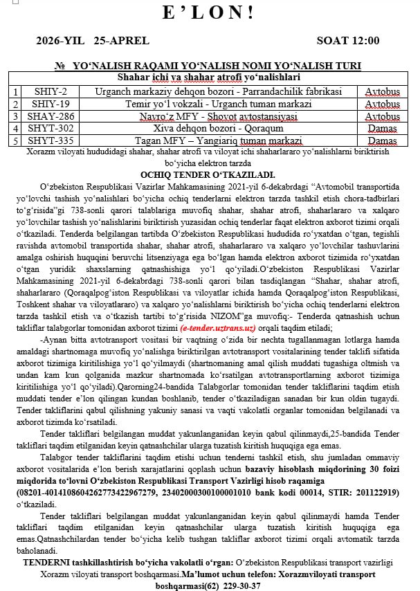 Tender Transport vazirligi Xorazm viloyati transport boshqarmasi tomonidan 2026-yil 26-aprel kuni soat 12:00 da o‘tkaziladi.
