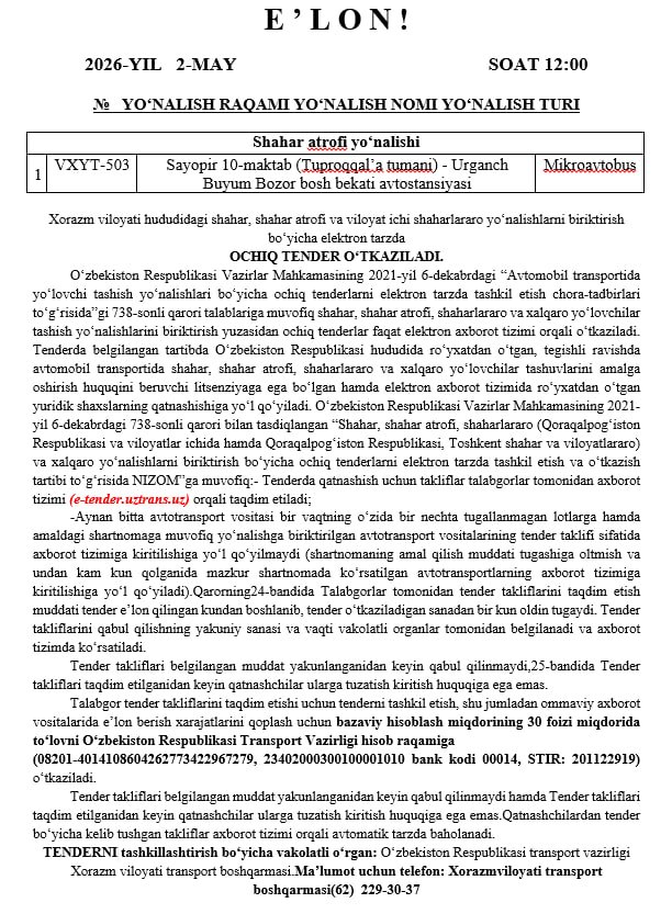 Tender Transport vazirligi Xorazm viloyati transport boshqarmasi tomonidan 2026-yil 2-may kuni soat 12:00 da o‘tkaziladi.