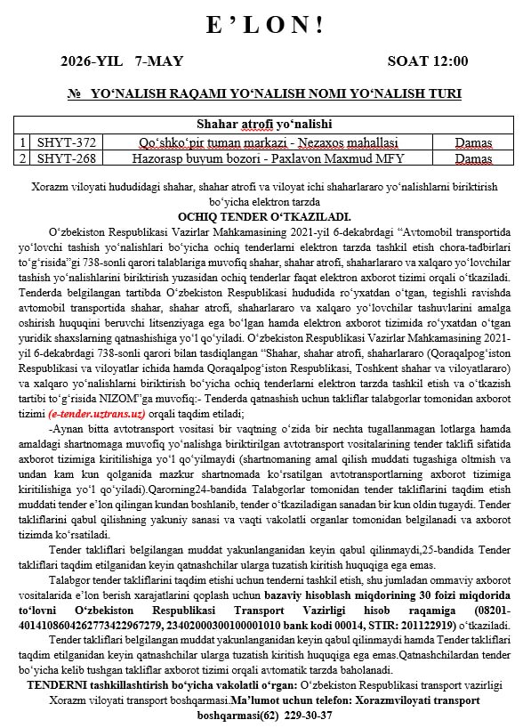 Tender Transport vazirligi Xorazm viloyati transport boshqarmasi tomonidan 2026-yil 7-may kuni soat 12:00 da o‘tkaziladi.